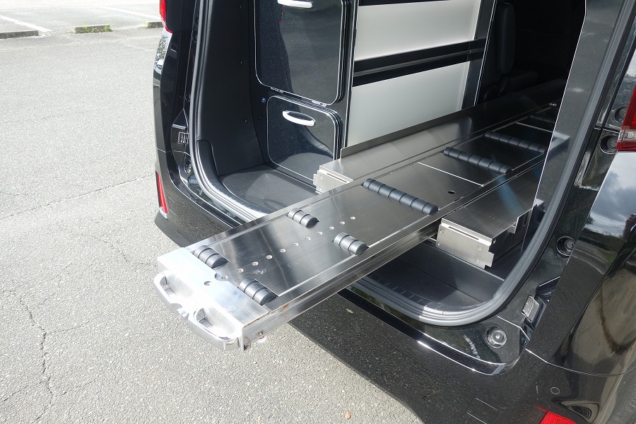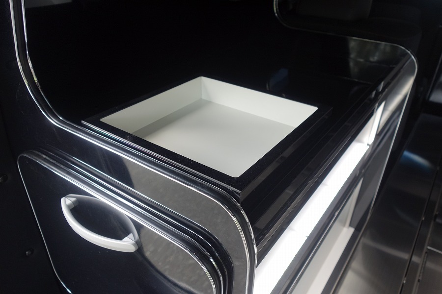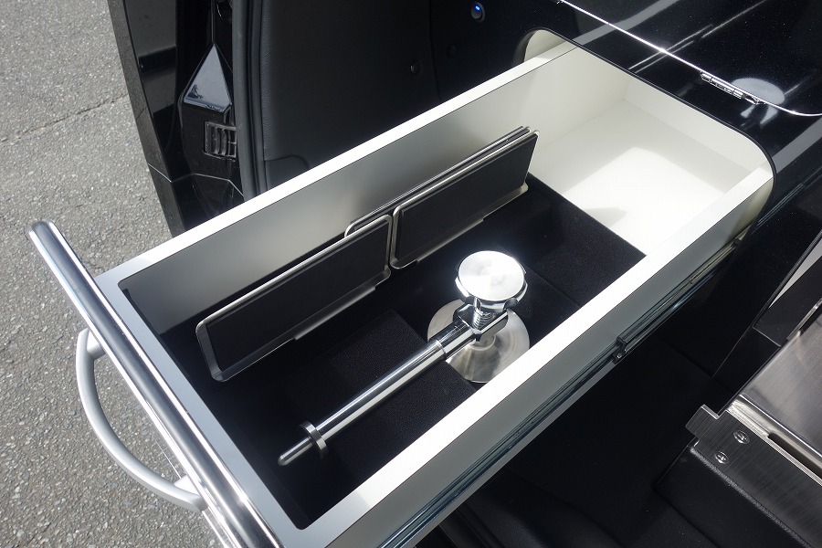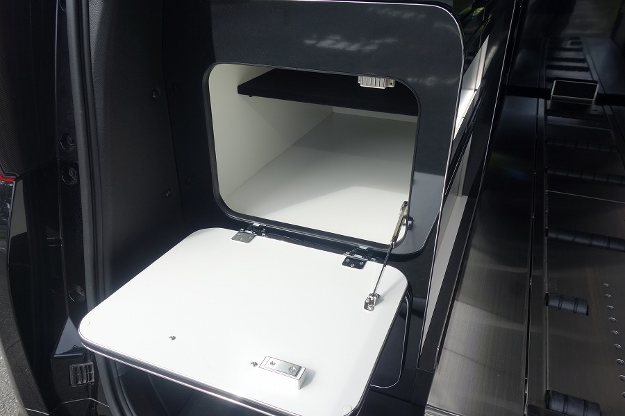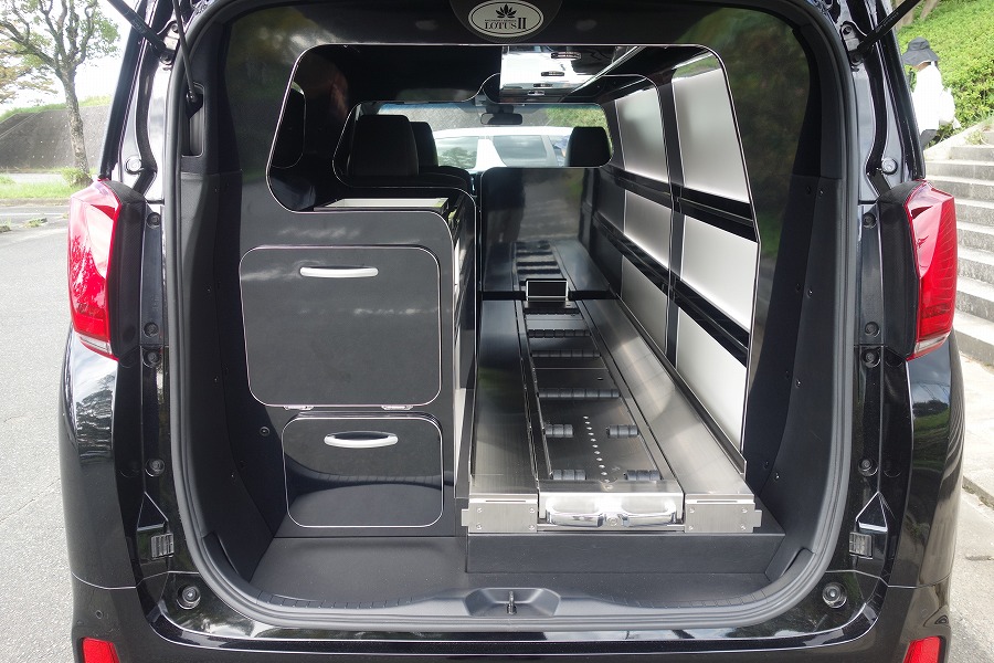 弊社オリジナル特別バン型霊柩車「ロータスⅡ」の多彩な収納スペースや、位牌遺影骨壺置きはセレモニー用に