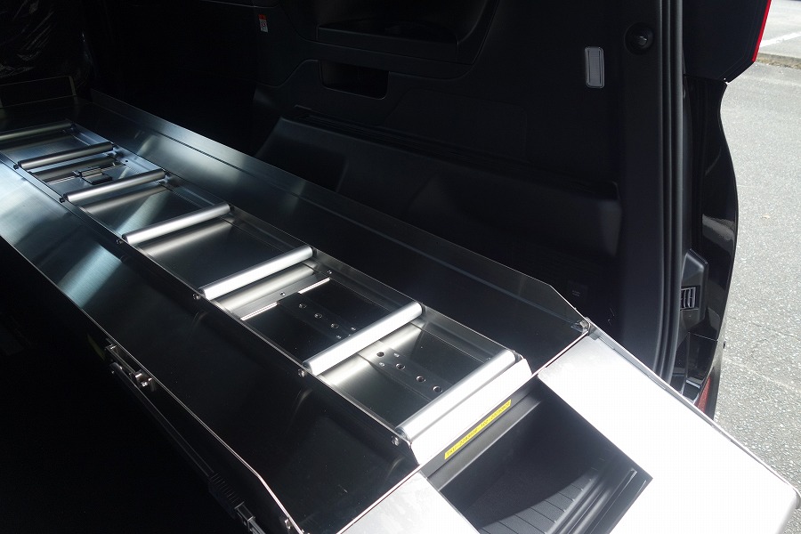お車は搬送に特化して使用するとのことで乗車定員3名に変更し、棺台にはタルガK固定式ローラーを搭載致しました。