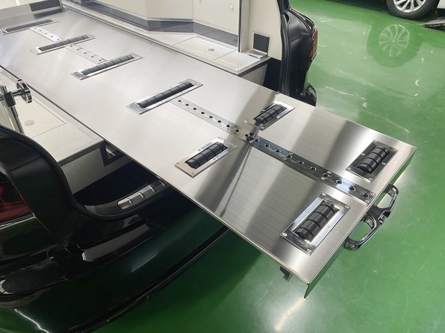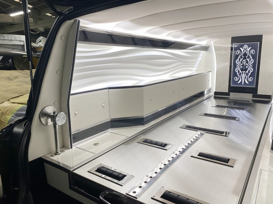 リムジン霊柩車は荷物の収納スペースを設置できる場所が少ないのですが、