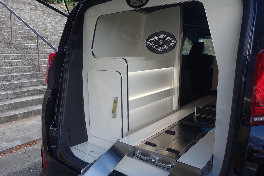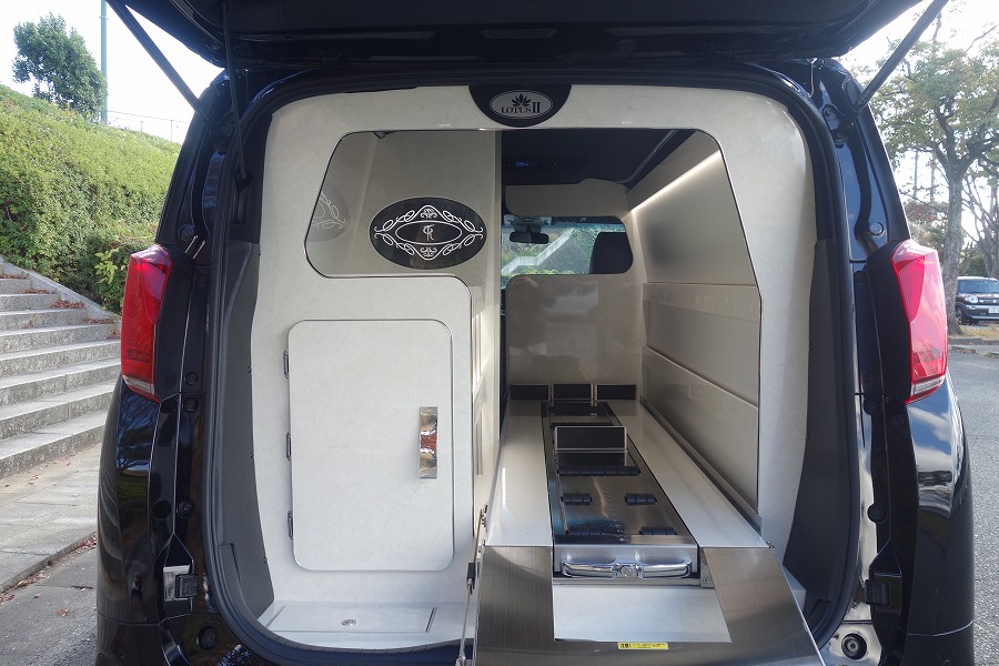 乗車定員3名に変更。内装は弊社のセレモニーと搬送を兼用できる特別バン型霊柩車ロータスⅡ仕様で