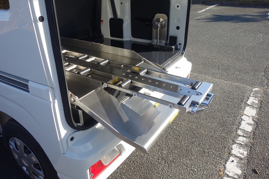乗車定員2名に棺台にはお棺・ストレッチャー兼対応可能な 【タルガH 引出式( 2,050 mm ✕ 600 mm棺対応)】を