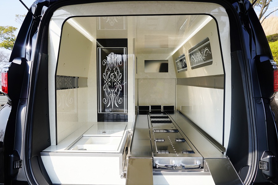 棺室と客席を完全に間仕切りした仕様で、骨壺置きや位牌遺影置きも完備した機能性の高い一台となっております。